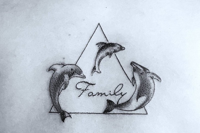 用三角几何环绕小海豚一家人,中间刻着family英文,寓意家庭和睦,美满幸福。