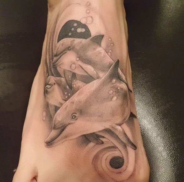 女生脚背点刺线条抽象小海豚纹身,个性十足。