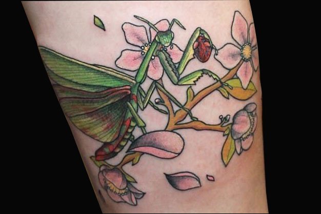 由于“螂”与“郎”为谐音,因此螳螂纹身又具有嫁得如意郎君之意。深受年轻女性的喜爱,很多年轻女子纹身螳螂,希望能够早日寻得意中人,成就一段美好的姻缘。