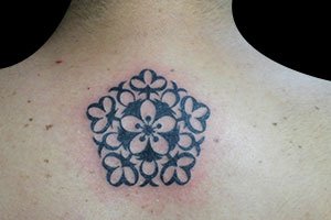 如果说粉色的桃花是娇艳美丽,那么黑白的桃花就是独特罕见。看这幅由桃花和类似三叶草图案组成的五边形纹身,再加上黑色线条,非常特别,非常吸睛呢。