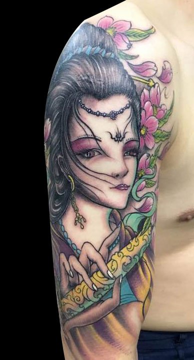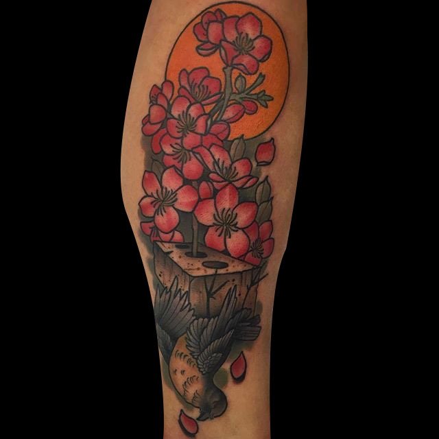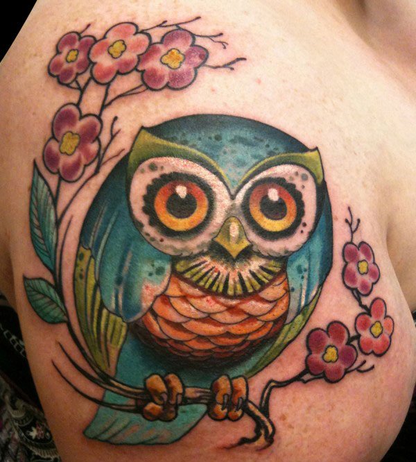 男人味十足的男生可能会觉得桃花纹身只适合女生,其实不然。看,雄性代表猫头鹰伫立在桃花盛开的桃树中,调皮当中也不缺男子气概的呢。