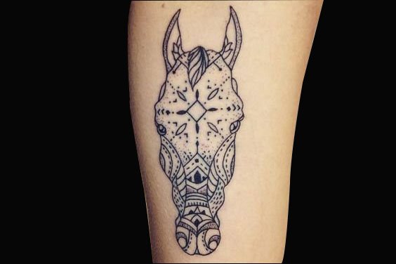 黑色点刺风格的马头纹身,加上一些对称的设计,突出了马坚毅的神韵。