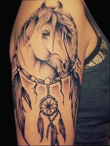 黑色点刺纹身捕梦网和马纹身图案,两种美好的事物结合在一起,捕获美丽的梦幻。