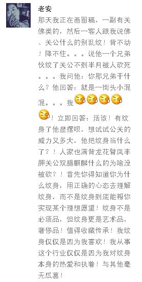 那天我正在画图稿,一副有关佛类的,然后一客人跟我说佛、关公什么的别乱纹!背不动!降不住。。。说他一个兄弟伙纹了关公不到半月被人砍死。。。我问他:你那兄弟干什么?他回答:就是一街头小混混。。。我mo-流汗mo-流汗mo-流汗mo-流汗mo-流汗!立即回答:活该!有纹身了他显摆呗,想试试公关的威力又多大,他把纹身当什么了?!人家也满背