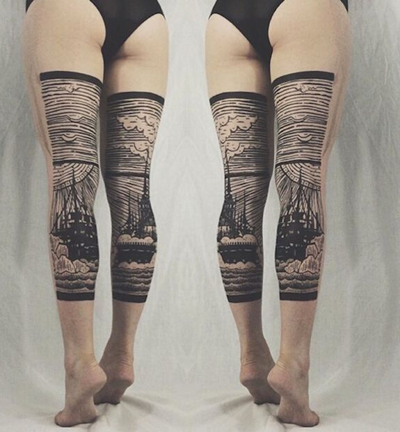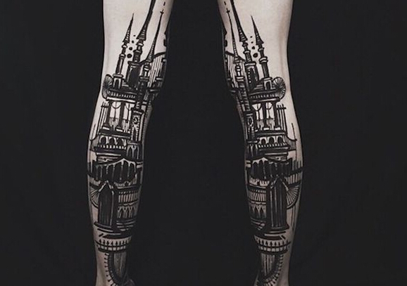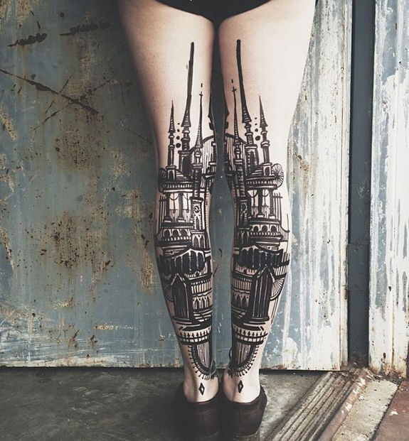 腿部纹身。这套纹身艺术作品,主要以风景和建筑为题材,结合人体艺术,利用人体的对称感和立体感,打造视觉上的纹身艺术惊艳效果的