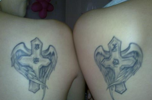她们的情侣纹身图是一个被翅膀环绕的十字架,十字架里面的字是用歌特字体写的对方的名字,图的含义就是她们希望能一直在一起,直到她们老去,直到她们离开这个世界,然后一起舞动她们墓碑上的翅膀带着对方的墓碑飞向天堂,然后用这个墓碑上的名字找到彼此。 这幅情侣纹身图的深刻含义让我们为之感动,也许很多人不能理解她们那种特殊的感情,但是我们能做的就是为她们祝福,希望她们能一直坚持自己的选择,做彼此的风帆一起掌握幸福生活的方向。