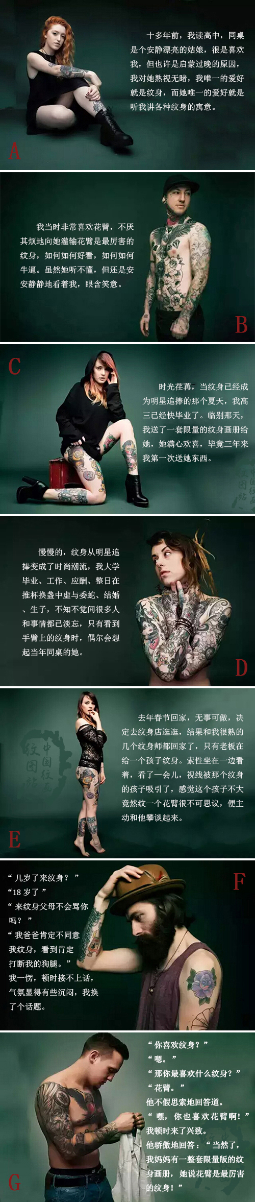 去年春节回家,无事可做,决定去纹身店逛逛,结果和我很熟的几个纹身师都在忙,索性坐在一边看他给别人纹身,看了一会儿,视线被那个纹身的孩子吸引了,感觉这孩子在我们这个小县城能纹身听不可思议,思想很前卫,便主动过去和他攀谈起来。