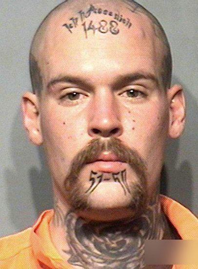 这是信守“白人至上主义/纳粹”理念的囚犯会有的刺青。1488以双位数拆开当作14与88来看时,14的意义是纳粹领袖David Lane曾讲过的一句14字名言。88则是26字母当中第8个字母H重复两次之意,也就是88=HH=Heil Hitler=希特勒万岁。