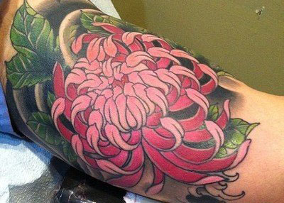 纹身图案都是非常受欢迎的;当然,也有些人喜欢纹素色的菊花,单单只是以黑色的线条陪衬,效果同样出众。那么我们看一下菊花