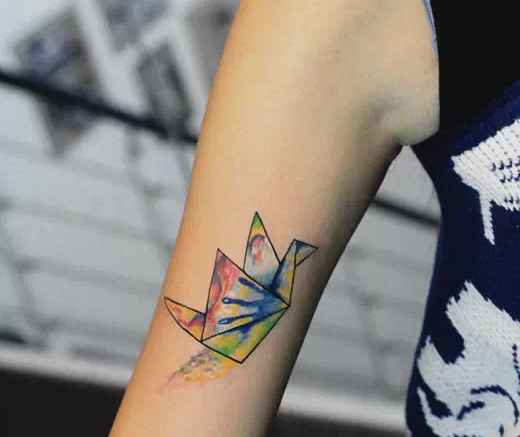 关于千纸鹤有很多的美丽传说,如果每天坚持折一个千纸鹤,坚持一千天,就能给自己喜欢的人带来幸福和安康,也能给爱人带来幸福和好运,还有一个传说是说所折叠的千纸鹤能够帮助他实现一个愿望。很多人选择千纸鹤纹身大概也是知道这样一个美丽传说的吧,也许是对千纸鹤给予希望,希望它们能完成自己的心愿,千纸鹤纹身能够让自己爱的人幸福、安康。
