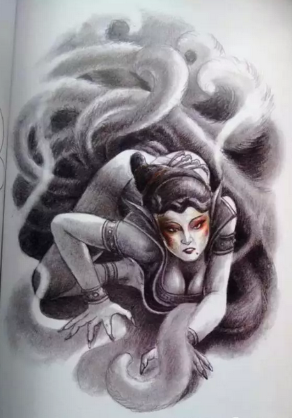 现在纹身的人群大多数都是年轻人,所以对于九尾狐有了新的阐述。从近代爱情故事和影视作品中,九尾狐往往都是为爱放弃了千年道行。狐狸给人的感觉可能是比较狡猾,也是比较妩媚,所以民间有一种说法:“狐狸精”,形容的就是运用自身的美色引诱男子的一类人。