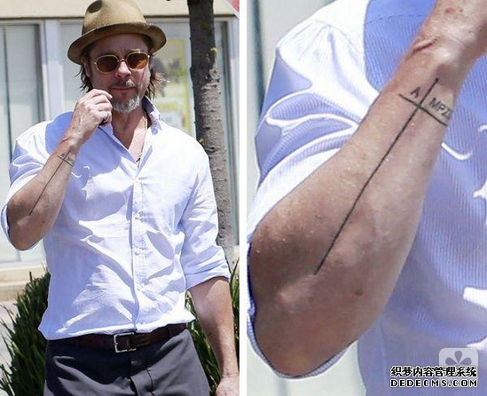 近日有眼尖的纹身爱好者发现影星皮特的手臂上新添了一处纹身,这处纹身也是相当的抽象,简单的十字线条纹身搭配上了一些字母纹身,左边是单独的字母A纹身,右边是mpz等字母纹身。虽然布拉德·皮特暂时未对此纹身做出解释,然而不难让人猜到其实这个纹身是为家人做的,字母A就是Angelina Jolie名字的首个字母,其他的字母也分别代表着他们孩子的名字。