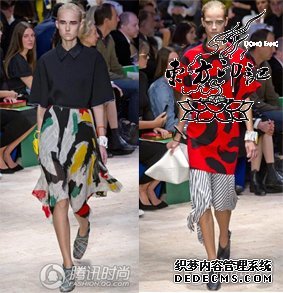 这款将涂鸦艺术引入到服饰中的时尚设计是由法国本土服装品牌克洛伊(Chloe)率先创作出来的,在其2014春夏系列的秀场上,克洛伊(Chloe)的纹身服饰包括涂鸦款的大衣,涂鸦款的雪纺百褶裙和黑红涂鸦长款T恤,这类纹身服饰早已摆脱了经典的纹身图案,而是追求涂鸦艺术的随意感,几种不同颜色的随意融合便会呈现出一种街头涂鸦的艺术范儿,虽然不同于纹身图案的精雕细琢,但是这种随意涂鸦的癫狂创作,还是别有风味的。