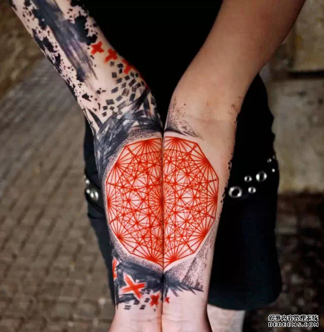 抽象的纹身图案有时候所表达出来的样子看起来会很无厘头,但是不正是艺术的精华部分吗?在纹身店做纹身的客户当中,也有不少的客户钟情于抽象纹身图案。在抽象纹身当中,几何纹身图案的拼接也占有了很大一部分。