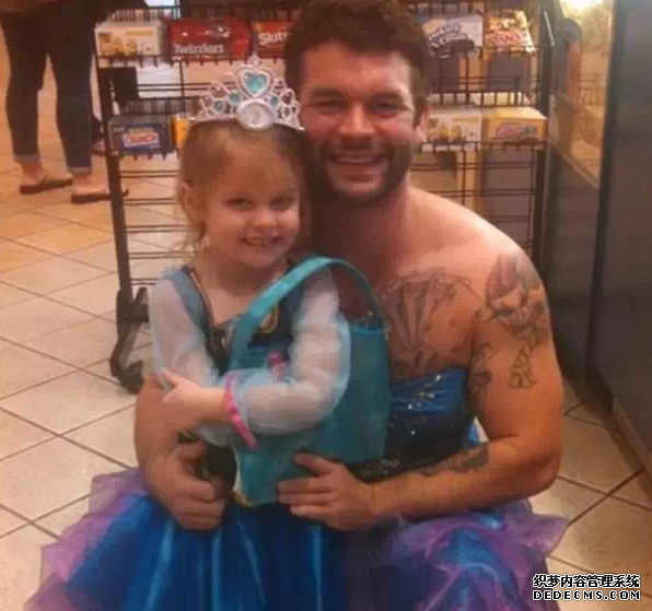 年度好叔叔有着很多的纹身,因为4岁的小侄女要去看《灰姑娘》,不敢一人穿着小礼服,于是这位叔叔便穿上了侄女同款的蓝色抹胸礼服陪配她一起去看。