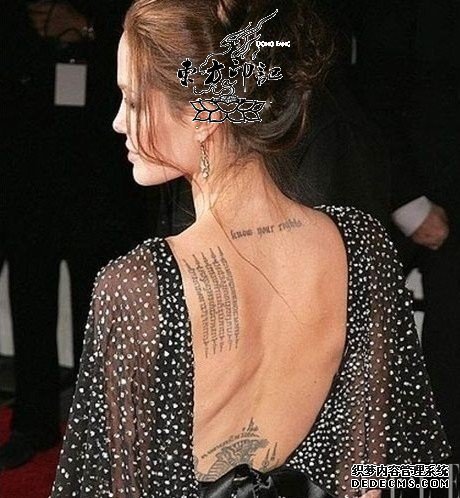 好莱坞著名女星安吉丽娜朱莉是一个不折不扣的纹身控,其身上的纹身图案不下10处,而其中最为经典的当属其后背的孟加拉虎纹身图案,和肩膀上的泰国经文纹身,据悉这两个纹身图案都是在泰国纹的,而其中的经文纹身则是由泰国著名的纹身大师阿赞师傅为其纹的,据纹身爱好者透露,安吉丽娜朱莉的这处泰国经文纹身算是开创了这类纹身的先河,朱莉率先纹身,随后出现了一大批跟风者。