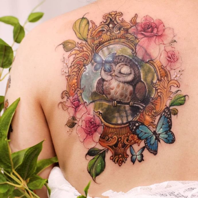 背部的纹身在蝴蝶骨的衬托下会十分漂亮。但是,这一位置仿佛恰好被bra遮挡了,有一种若隐若现的感觉。