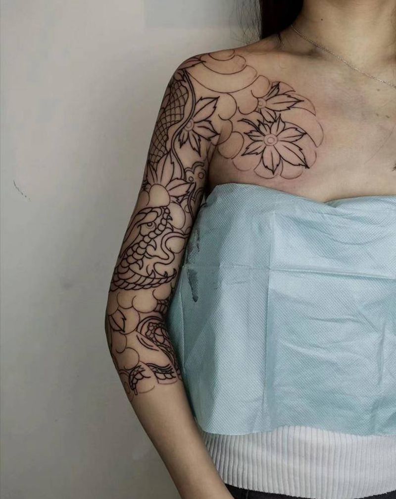 传统纹身图片_手臂老传统鱼樱花纹身图案