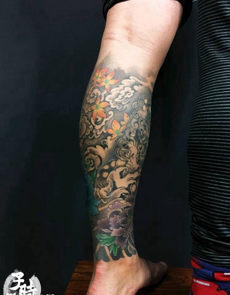 当前位置: 首页 >北京市纹身店-北京子时纹艺刺青工作室纹身图案>唐狮凤凰纹身图片_腿部传统宗教原创成品纹身图案