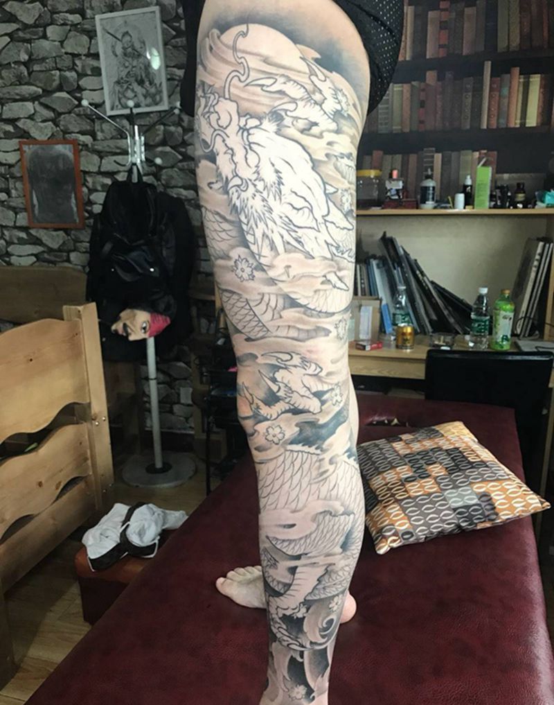 • T网红王老大花腿龙纹身图片_腿部新传统纹身图案