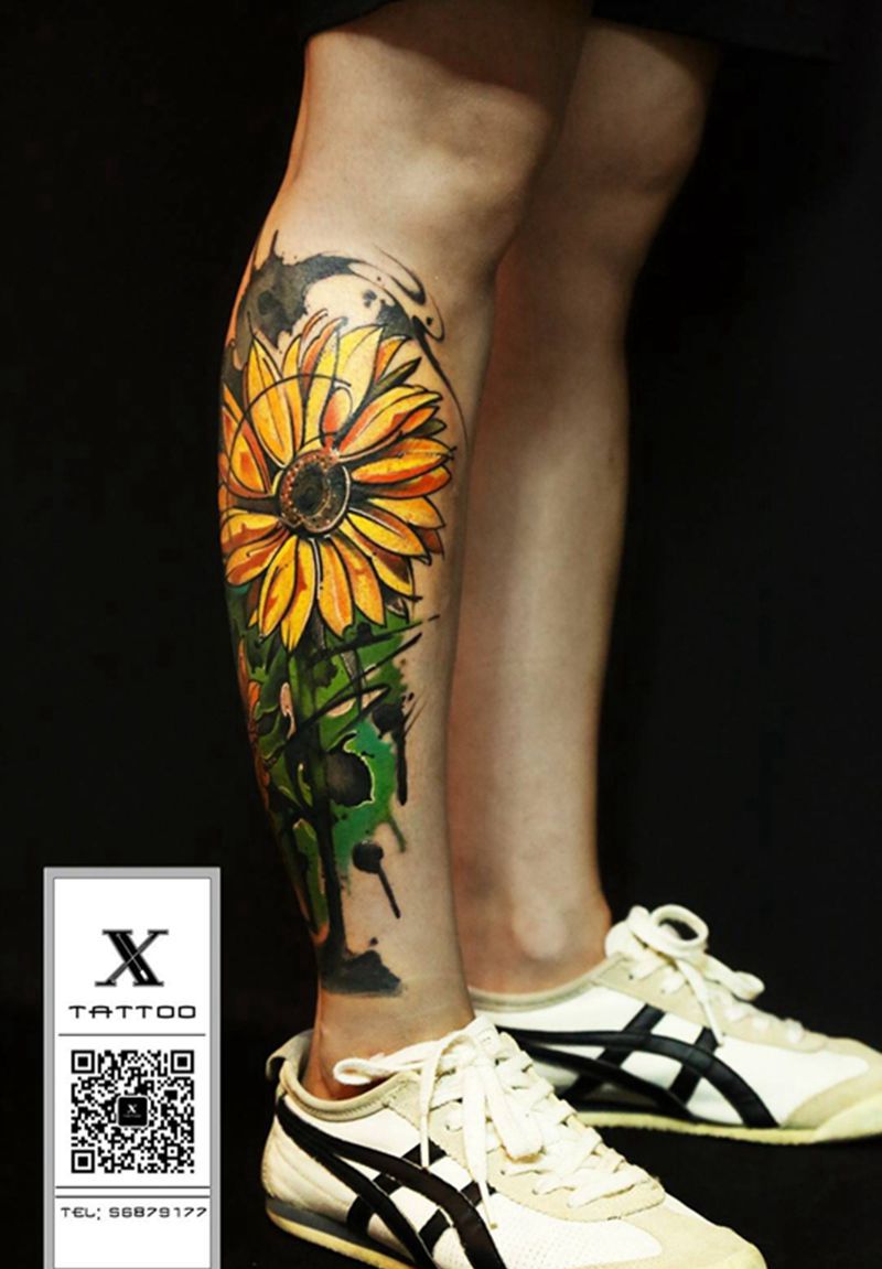 当前位置: 首页 >北京市纹身店-翛刺青纹身图案>向日葵纹身图片_成品腿部写实原创植物概念纹身图案