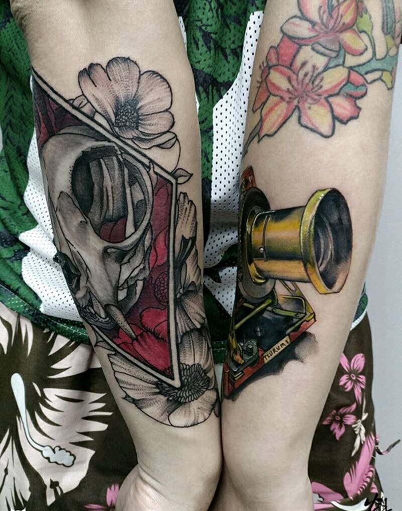 当前位置: 首页 >北京市纹身店-鹤见刺青処纹身图案>【头骨&花花】纹身图片_手臂欧美习俗清新写实动物植物成品纹身图案