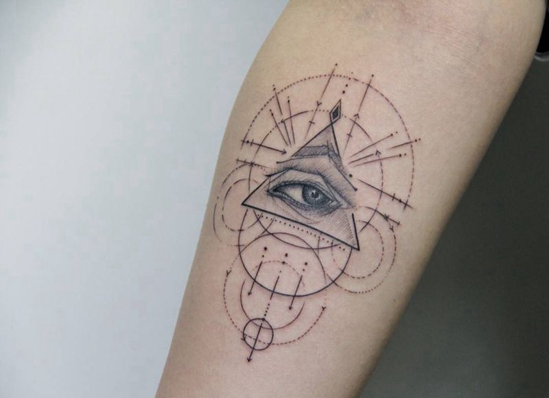 当前位置: 首页 >北京市纹身店-MDZ STORE流行文化体验店纹身图案>几何+眼纹身图片_手臂点刺几何圆圈 直线纹身图案
