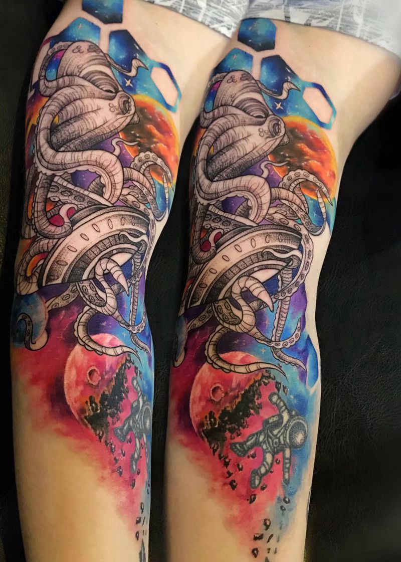 • T网红王老大花腿龙纹身图片_腿部新传统纹身图案