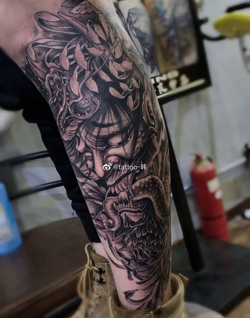 • T网红王老大花腿龙纹身图片_腿部新传统纹身图案