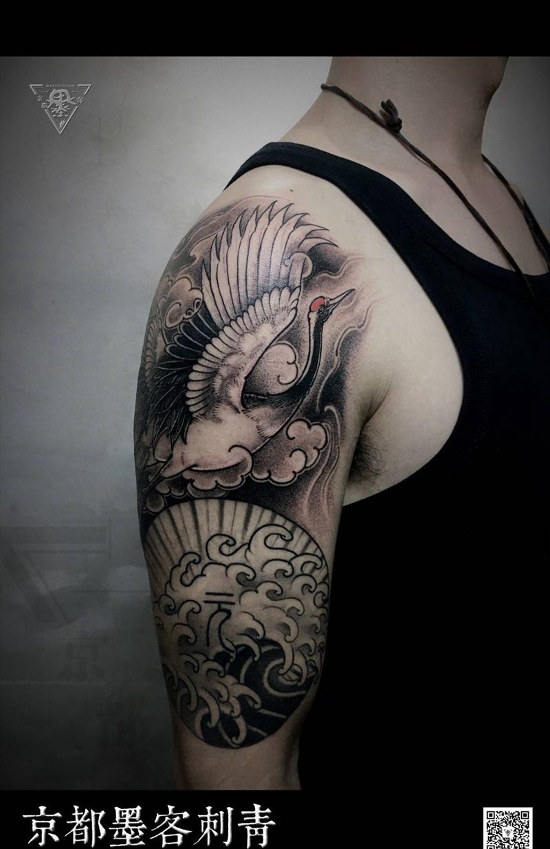 京都墨客刺青-仙鹤纹身图片_原创贴纸字符动物清新传统手臂成品手稿纹身图案