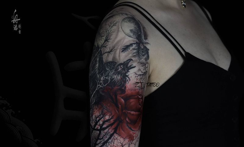 当前位置: 首页 >北京市纹身店-北京舟添刺青纹身图案>夜莺与玫瑰纹身图片_手臂欧美写实夜莺暗黑玫瑰纹身图案