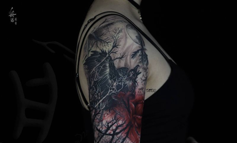 当前位置: 首页 >北京市纹身店-北京舟添刺青纹身图案>夜莺与玫瑰纹身图片_手臂欧美写实夜莺暗黑玫瑰纹身图案