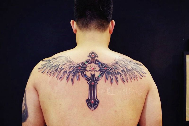【翅膀+十字架】纹身图片_成品手稿背部写实欧美宗教原创纹身图案