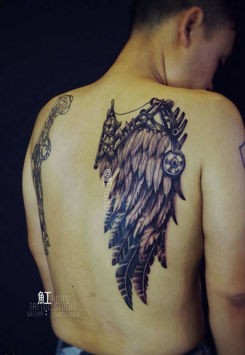 原创设计-火枪&翅膀纹身图片_成品手稿背部写实欧美原创静物纹身图案