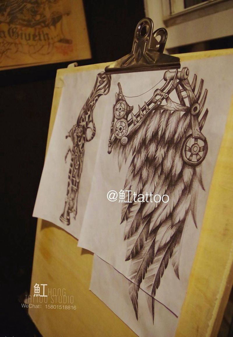 当前位置: 首页 >北京市纹身店-魟Tattoo-纹身设计工作室纹身图案>原创设计-火枪&翅膀纹身图片_成品手稿背部写实欧美原创静物纹身图案