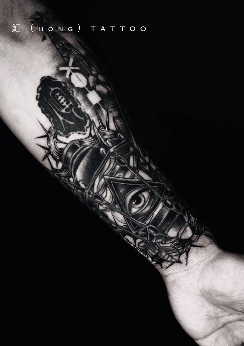 当前位置: 首页 >北京市纹身店-魟Tattoo-纹身设计工作室纹身图案>神灯&上帝之眼纹身图片_手臂腿部欧美写实几何神灯上帝之眼荆棘纹身图案