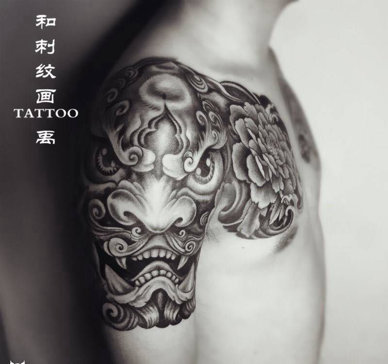 当前位置: 首页 >北京市纹身店-北京和刺纹身艺术工作室纹身图案>唐狮子牡丹纹身图片_成品肩部手臂传统花牡丹花唐狮子狮子纹身图案