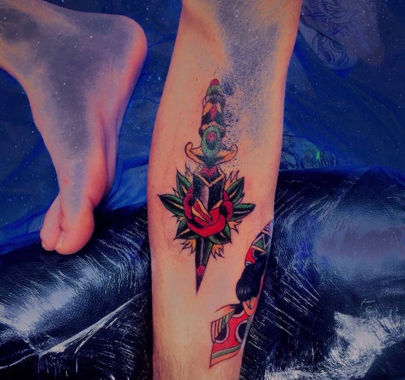• T包小腿吹火男+阿多福纹身图片_腿部老传统新传统吹火男阿