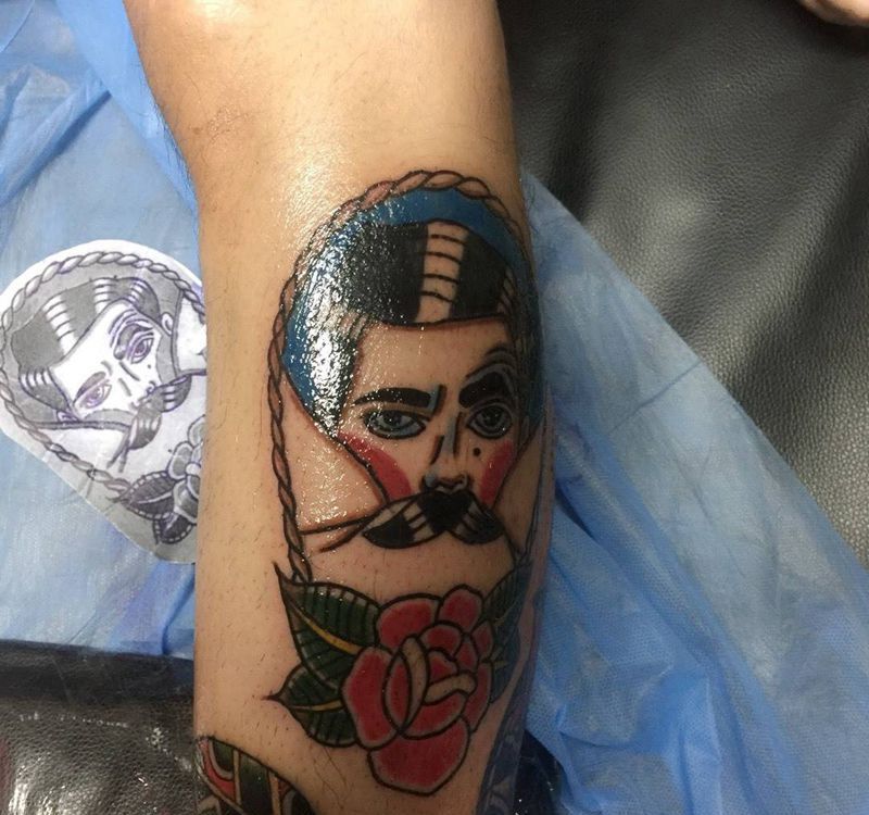 • T包小腿吹火男+阿多福纹身图片_腿部老传统新传统吹火男阿