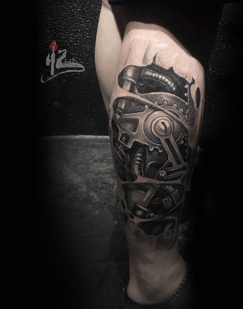 当前位置: 首页 >北京市纹身店-周忆刺青(三里屯)纹身图案>小腿外侧机械腿纹身图片_