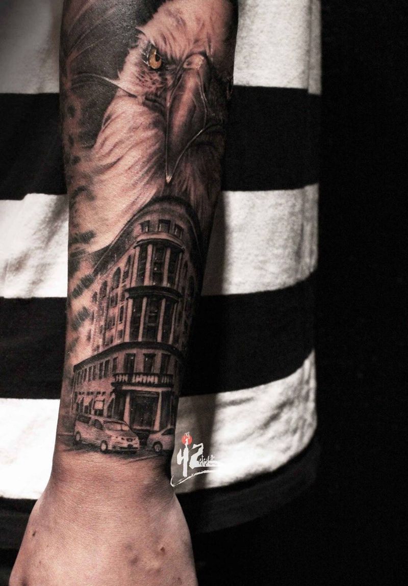 当前位置: 首页 >北京市纹身店-周忆刺青(三里屯)纹身图案>小臂鹰与建筑结合纹身图片_