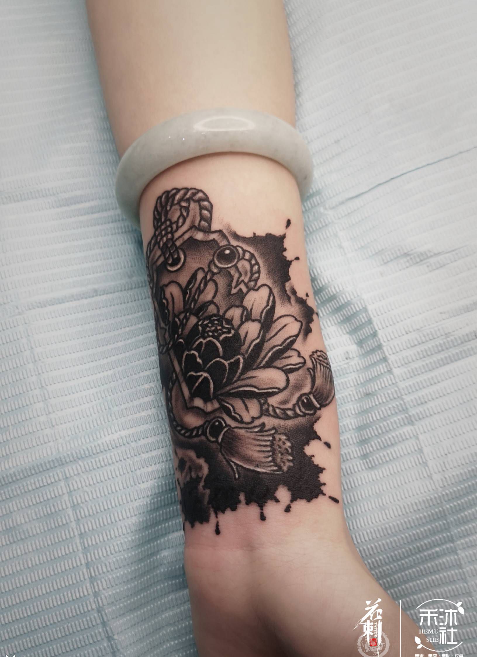 御守泼墨遮盖纹身图片_手臂新传统水墨牡丹御守纹身图案