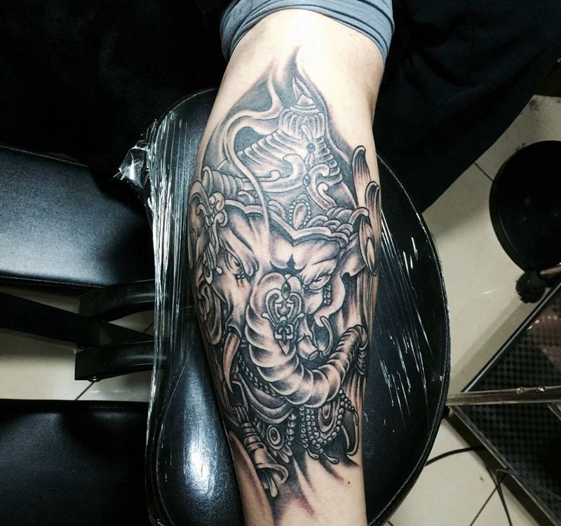 今日作品!彩色象神完成!纹身图片_成品腿部传统宗教动物纹身图案