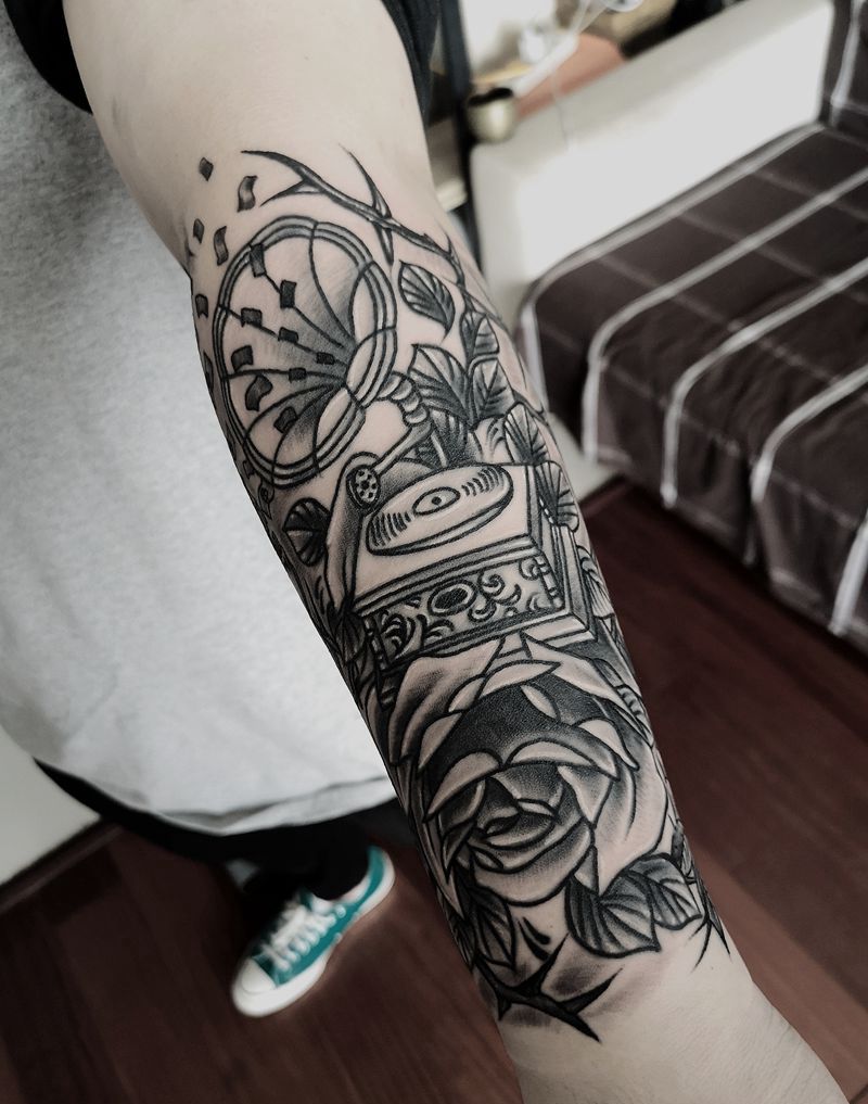 当前位置: 首页 >北京市纹身店-北京花刺纹身工作室纹身图案>school留声机纹身图片_手臂Old School纹身图案