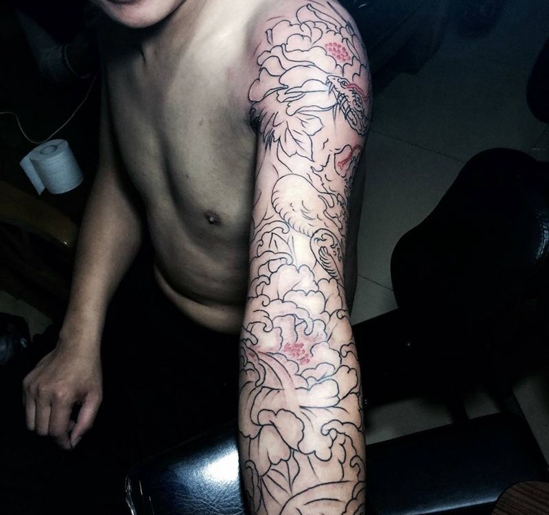 今日作品花臂割线。未完待续纹身图片_手臂传统植物动物纹身图案