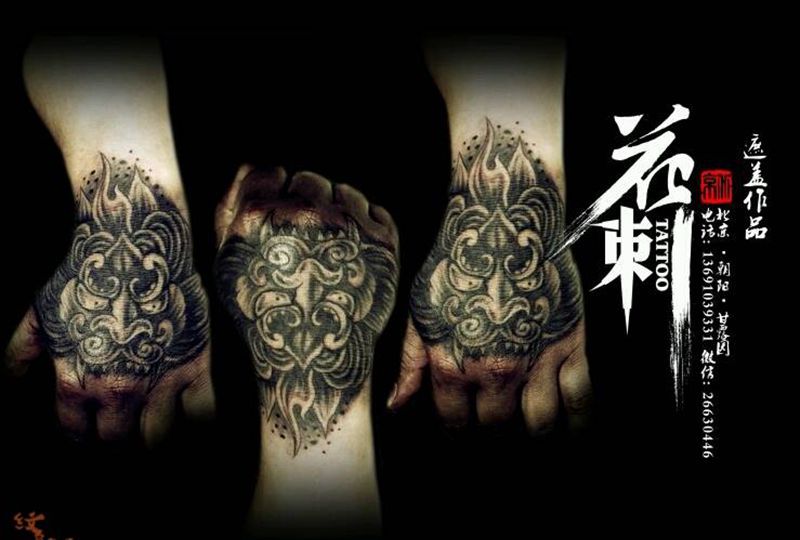 手背遮盖唐狮纹身图片_传统手部原创纹身图案