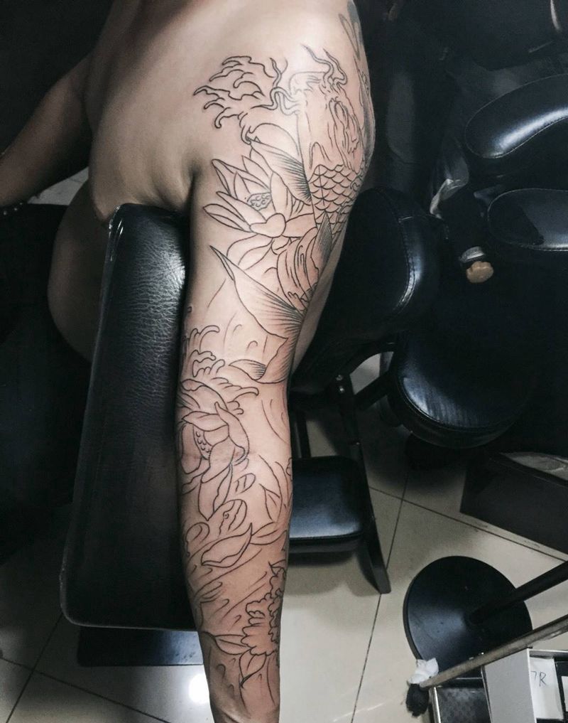 昨晚加班花臂割线纹身图片_手臂传统动物植物纹身图案
