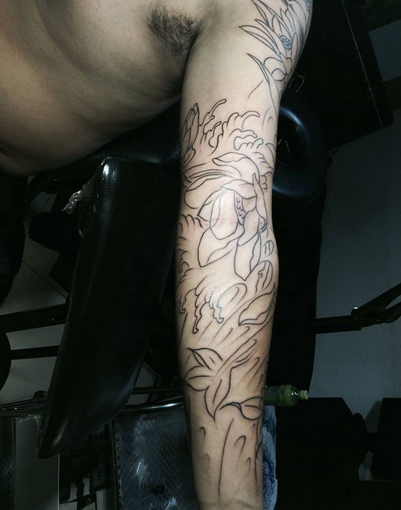 昨晚加班花臂割线纹身图片_手臂传统动物植物纹身图案