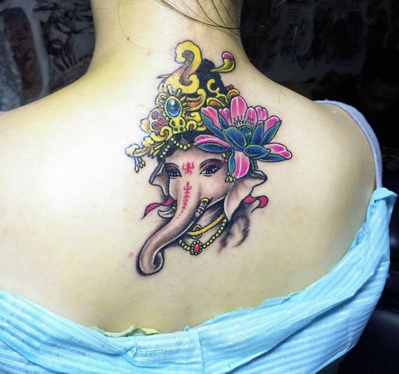 今日作品小象神遮盖完成!纹身图片_成品背部颈部传统动物植物宗教纹身图案