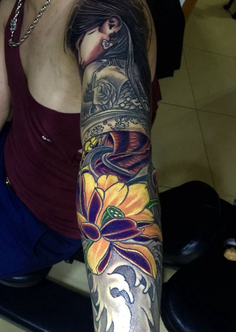 今日工作花臂未完成下次继续!纹身图片_手臂传统人物植物动物纹身图案